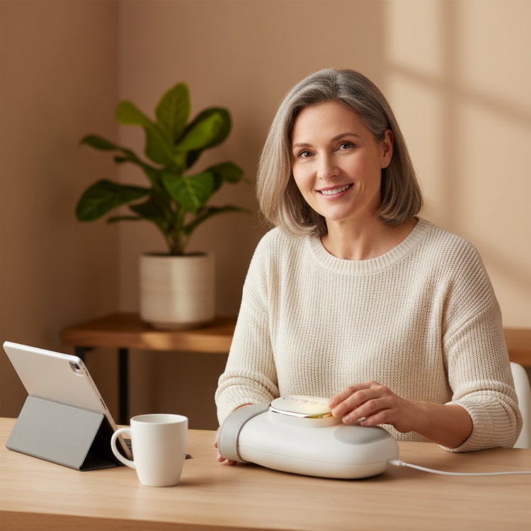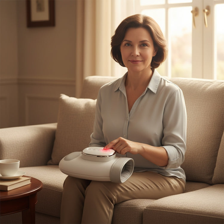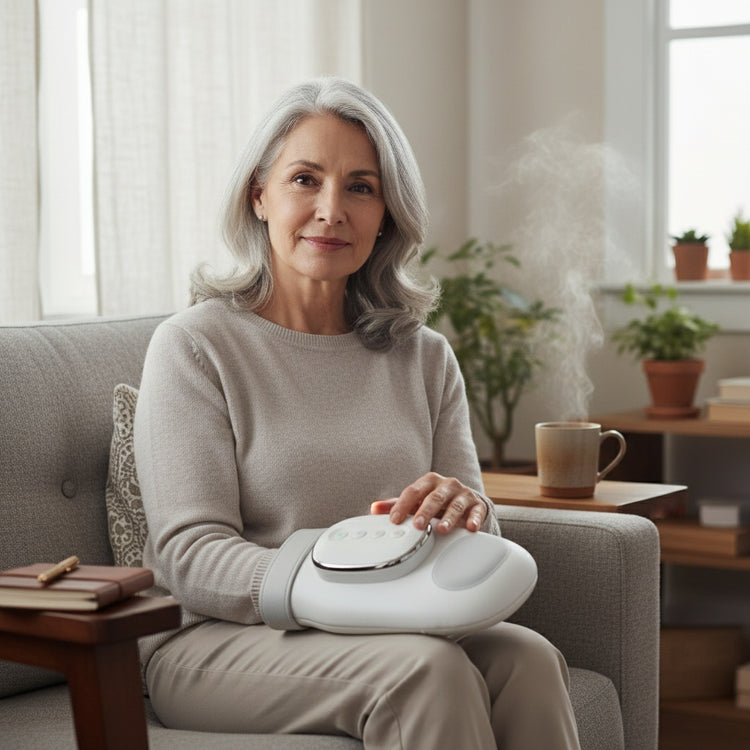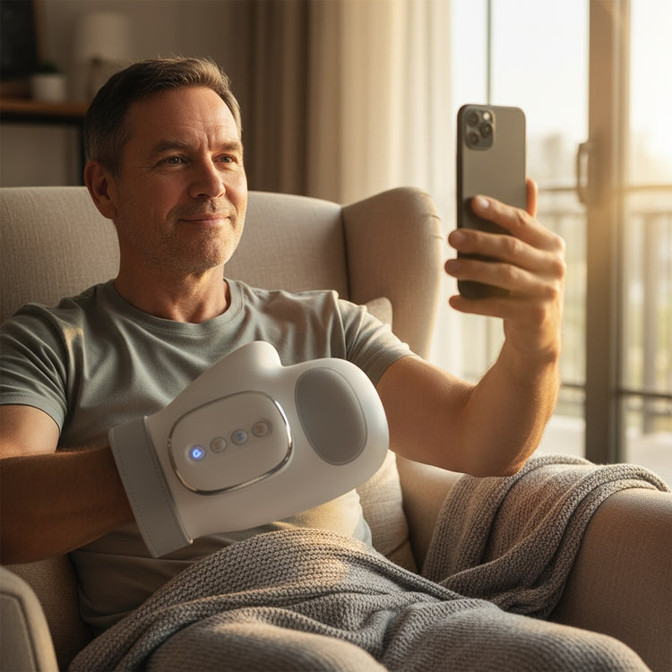 See how our massager warms to 125°F in under a minute and gently compresses each finger. Watch real users enjoy soothing vibration and custom air compression that eases arthritis pain. Experience comfort at home, the office, or on the go.