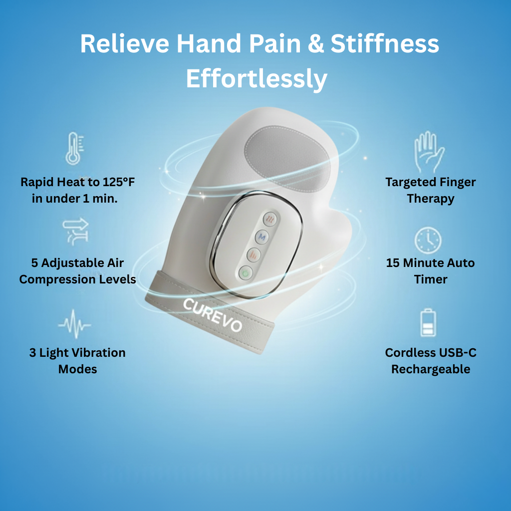 Discover the power of Curevo™ Hand Relief Massager 2.0, engineered to melt away stiffness, throbbing pain, and numbness through gentle heat and air compression.